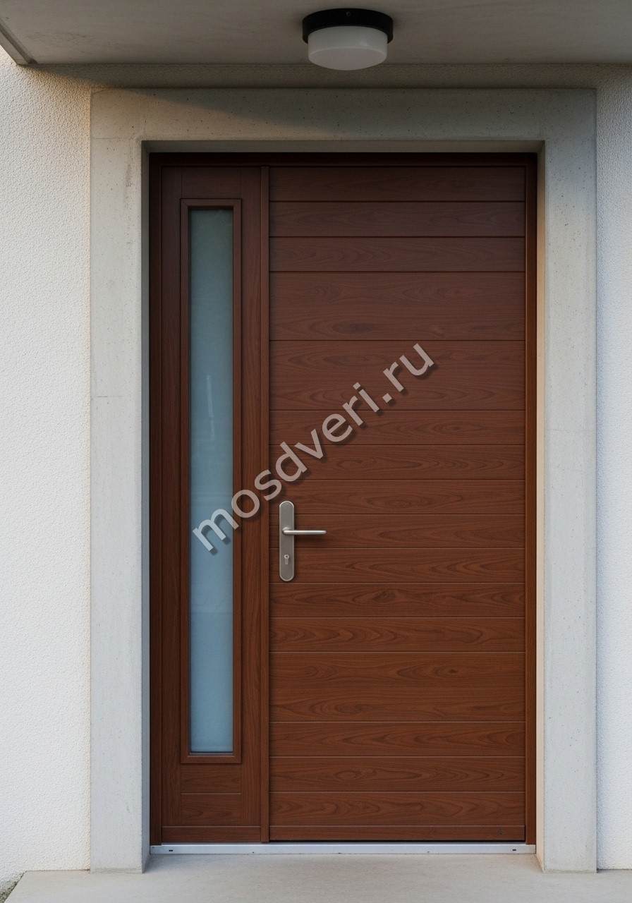 Современная входная дверь для загородного дома коричневая со стеклянной вставкой